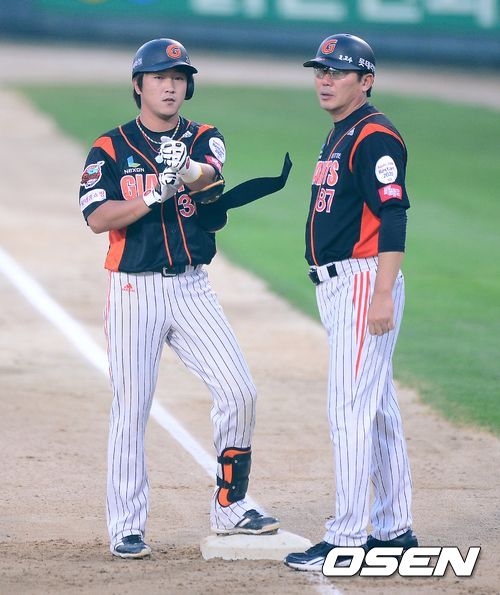 28일 오후 광주 무등경기장에서 열린 '2013 한국야쿠르트 세븐 프로야구' KIA 타이거즈와 롯데 자이언츠의 경기, 1회초 2사 3루에서 롯데 정훈이 1타점 좌전 적시타를 날리고 기뻐하고 있다.