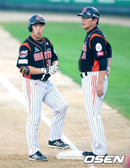 28일 오후 광주 무등경기장에서 열린 '2013 한국야쿠르트 세븐 프로야구' KIA 타이거즈와 롯데 자이언츠의 경기, 1회초 무사 1,3루에서 롯데 손아섭이 선제 1타점 좌전 적시타를 날리고 김응국 코치와 기뻐하고 있다.