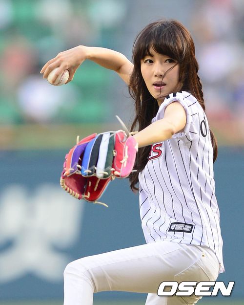 28일 오후 서울 잠실구장에서 열린 '2013 한국야쿠르트 세븐 프로야구' LG 트윈스와 넥센 히어로즈의 경기 시작 전 이정현이 멋진 폼으로 시구를 하고 있다.