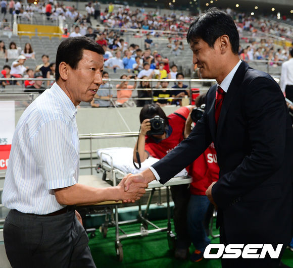 28일 오후 서울 상암동 서울월드컵경기장에서 열린 '현대오일뱅크 K리그 클래식 2013' FC 서울과 전북 현대의 경기에 앞서 전북 최강희 감독과 FC서울 최용수 감독이 악수를 나누고 있다.