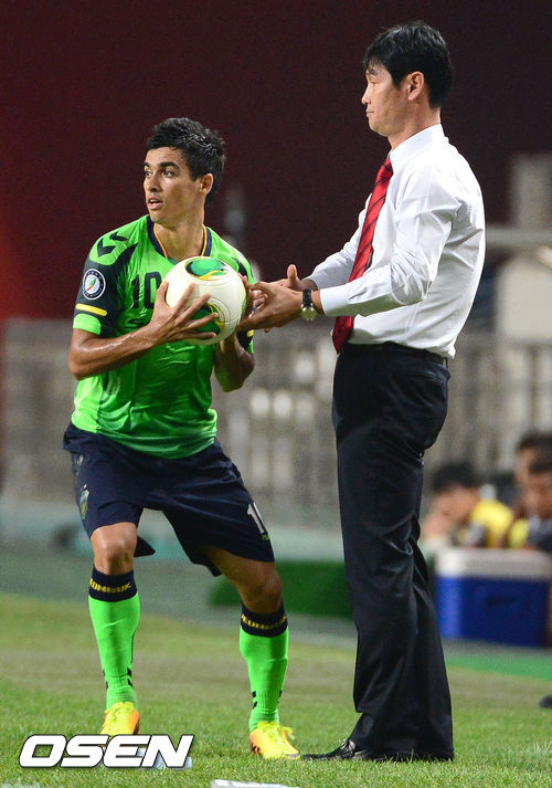 28일 오후 서울 상암동 서울월드컵경기장에서 열린 '현대오일뱅크 K리그 클래식 2013' FC 서울과 전북 현대의 경기, 전반 FC서울 최용수 감독이 전북 레오나르도에게 라인아웃 된 공을 전해주고 있다.