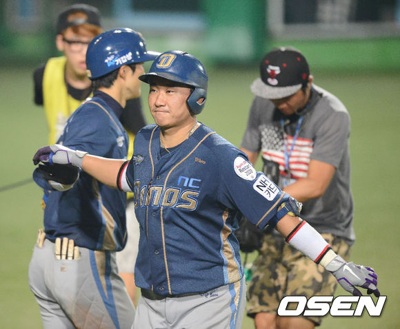 28일 오후 대구구장에서 열린 '2013 한국야쿠르트 세븐 프로야구' 삼성 라이온즈 와 NC 다이노스 경기, 5회초 1사 김태군 우월솔로 홈런을 날리고 홈인 이상호의 환영을 받고 있다.