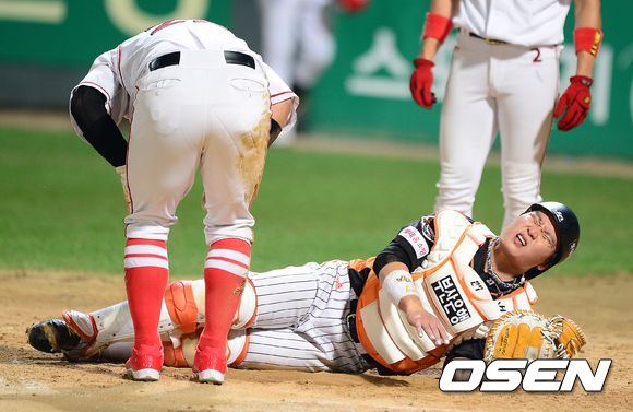 28일 오후 광주 무등경기장에서 열린 '2013 한국야쿠르트 세븐 프로야구' KIA 타이거즈와 롯데 자이언츠의 경기, 4회말 1사 1,3루에서 롯데 용덕한이 KIA 이종환의 우전 적시타에 1루주자 나지완을 태그아웃시키며 충돌, 괴로워하고 있다.