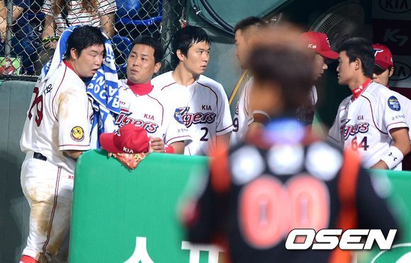 28일 오후 광주 무등경기장에서 열린 '2013 한국야쿠르트 세븐 프로야구' KIA 타이거즈와 롯데 자이언츠의 경기, 4회말 1사 1,3루에서 KIA 이종환의 우전 적시타에 1루주자 나지완이 홈에서 롯데 용덕한에 태그아웃당하고 더그아웃에서 동료선수들의 격려를 받고 있다.