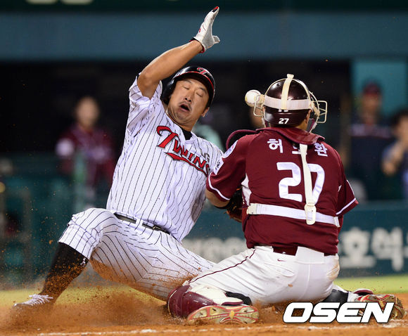 28일 오후 서울 잠실구장에서 열린 '2013 한국야쿠르트 세븐 프로야구' LG 트윈스와 넥센 히어로즈의 경기 5회말 1사 만루 윤요섭의 2타점 적시타에 2루주자 이병규가 홈에서 세이프되고 있다.