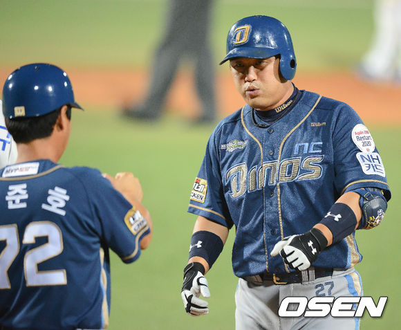 28일 오후 대구구장에서 열린 '2013 한국야쿠르트 세븐 프로야구' 삼성 라이온즈 와 NC 다이노스 경기, 5회초 2사 1,2루 이호준 1타점 적시타를 날리고 전준호 코치의 환영을 받고 있다.