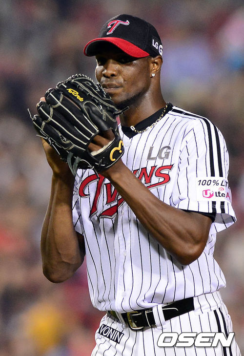 28일 오후 서울 잠실구장에서 열린 '2013 한국야쿠르트 세븐 프로야구' LG 트윈스와 넥센 히어로즈의 경기 7회초 2사 서건창을 뜬공으로 처리한 리즈가 글러브를 치며 기뻐하고 있다.