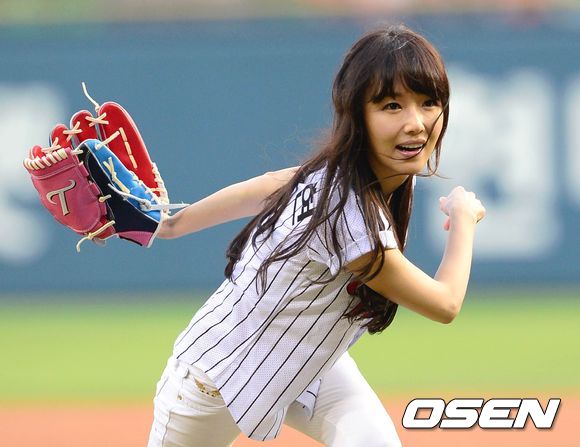 28일 오후 서울 잠실구장에서 열린 '2013 한국야쿠르트 세븐 프로야구' LG 트윈스와 넥센 히어로즈의 경기 시작 전 이정현이 멋진 폼으로 시구를 하고 있다.