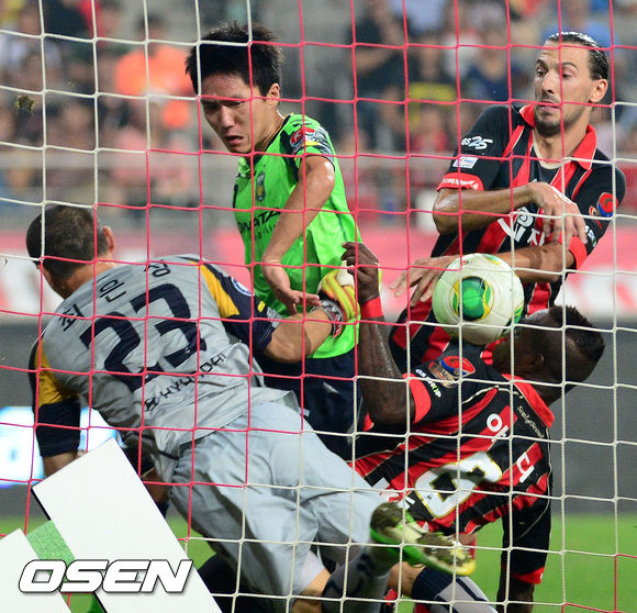 28일 오후 서울 상암동 서울월드컵경기장에서 열린 '현대오일뱅크 K리그 클래식 2013' FC 서울과 전북 현대의 경기, 후반 FC서울 아디의 헤딩슛이 전북 최은성 골키퍼의 손에 막히고 있다