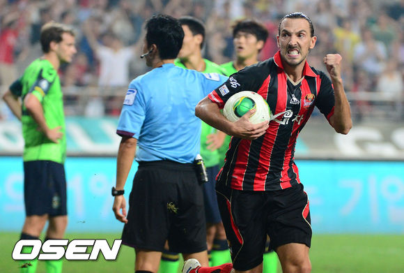 28일 오후 서울 상암동 서울월드컵경기장에서 열린 '현대오일뱅크 K리그 클래식 2013' FC 서울과 전북 현대의 경기, 후반 FC서울 데얀이 동점골을 넣고 환호하고 있다