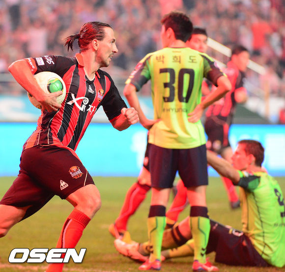 28일 오후 서울 상암동 서울월드컵경기장에서 열린 '현대오일뱅크 K리그 클래식 2013' FC 서울과 전북 현대의 경기, 후반 FC서울 데얀이 동점골을 넣고 환호하고 있다