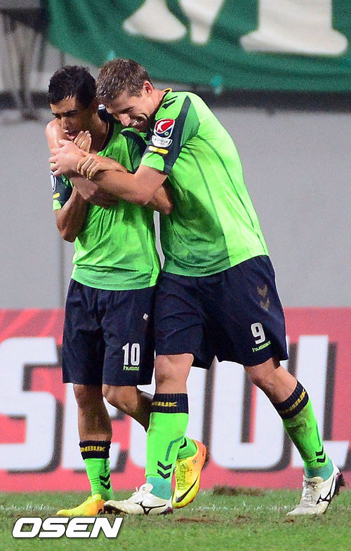 28일 오후 서울 상암동 서울월드컵경기장에서 열린 '현대오일뱅크 K리그 클래식 2013' FC 서울과 전북 현대의 경기, 후반 전북 케빈이 선취골을 넣고 레오나르도와 기뻐하고 있다