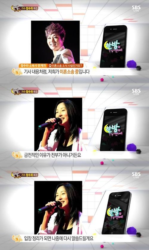 이날 방송에서는 정수라의 이혼 소송 보도와 관련된 이야기가 전파를 탔다. 이에 '한밤' 제작진은 정수라의 소속사 측과 전화연결, 사실여부를 질문했으며 이에 소속사 측 관계자는 "이혼 소송 중이다"라고 인정했다.