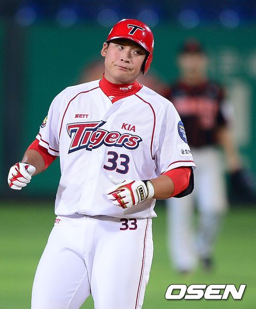 28일 오후 광주 무등경기장에서 열린 '2013 한국야쿠르트 세븐 프로야구' KIA 타이거즈와 롯데 자이언츠의 경기, 8회말 1사 1,3루에서 KIA 김주형이 역전 1타점 적시 2루타를 날리고 기뻐하고 있다.
