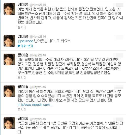 정미홍 대표는 28일 자신의 트위터를 통해 국가정보원과 검찰이 통합진보당 이석기 의원을 포함한 당직자 10명의 집과 사무실까지 압수수색한 것에 대해 "다 잡아들이세요"라며 응원의 메시지를 내놓았다.