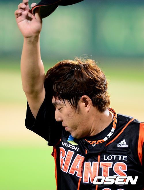 28일 오후 광주 무등경기장에서 열린 '2013 한국야쿠르트 세븐 프로야구' KIA 타이거즈와 롯데 자이언츠의 경기, 8회말 무사에서 롯데 김승회가 KIA 이범호에 중전안타를 허용하고 아쉬워하고 있다.