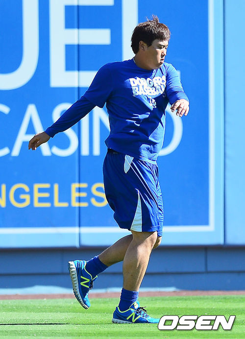 29일 (이하 한국시간) 미국 캘리포니아주 로스앤젤레스 다저스타디움에서 2013 메이저리그 LA 다저스와 시카고 컵스의 경기가 열릴 예정인 가운데 다저스의 류현진이 가장 먼저 그라운드로 나와 러닝 훈련을 하고 있다.