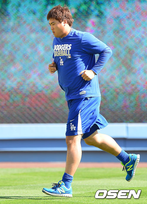 29일 (이하 한국시간) 미국 캘리포니아주 로스앤젤레스 다저스타디움에서 2013 메이저리그 LA 다저스와 시카고 컵스의 경기가 열릴 예정인 가운데 다저스의 류현진이 가장 먼저 그라운드로 나와 몸을 풀고 있다.