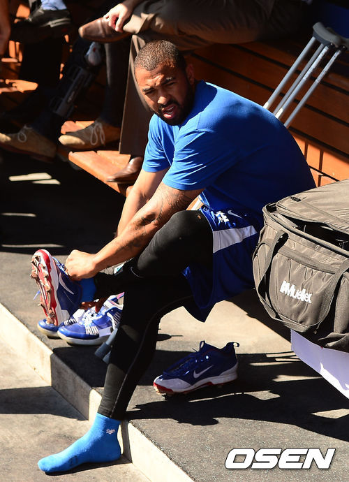 29일 (이하 한국시간) 미국 캘리포니아주 로스앤젤레스 다저스타디움에서 2013 메이저리그 LA 다저스와 시카고 컵스의 경기가 열릴 예정인 가운데 다저스의 맷 켐프가 훈련 준비를 하고 있다.