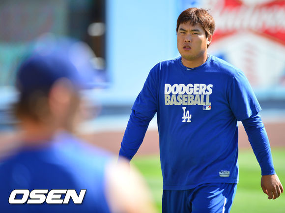 29일 (이하 한국시간) 미국 캘리포니아주 로스앤젤레스 다저스타디움에서 2013 메이저리그 LA 다저스와 시카고 컵스의 경기가 열릴 예정인 가운데 다저스의 류현진이 그라운드에서 몸을 풀며 커쇼를 바라보고 있다.