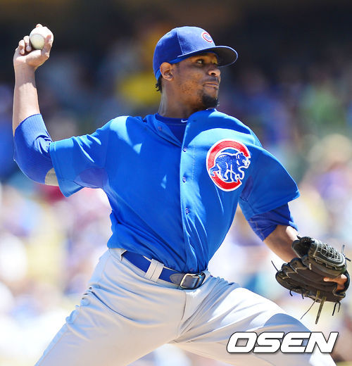 29일 (이하 한국시간) 미국 캘리포니아주 로스앤젤레스 다저스타디움에서 열린 2013 메이저리그 LA 다저스와 시카고 컵스의 경기, 시카고 컵스 선발 에드윈 젝슨이 힘차게 공을 뿌리고 있다.