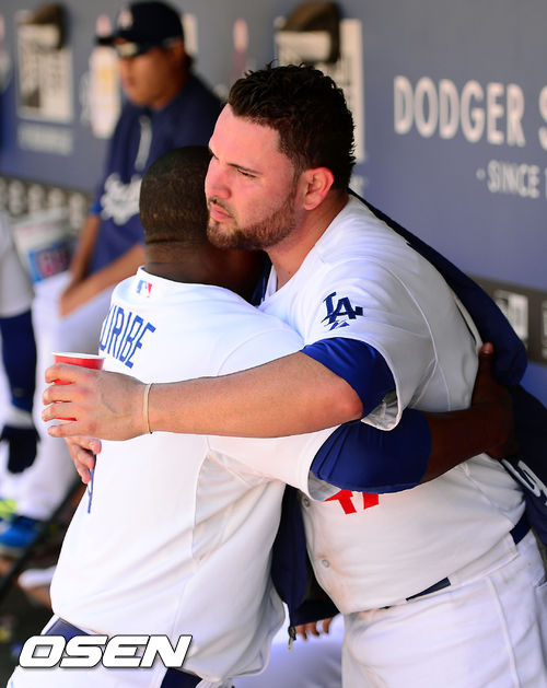 8회를 마친 다저스 놀라스코가 덕아웃에서 유리베와 포옹을 하고 있다. / rumi@osen.co.kr