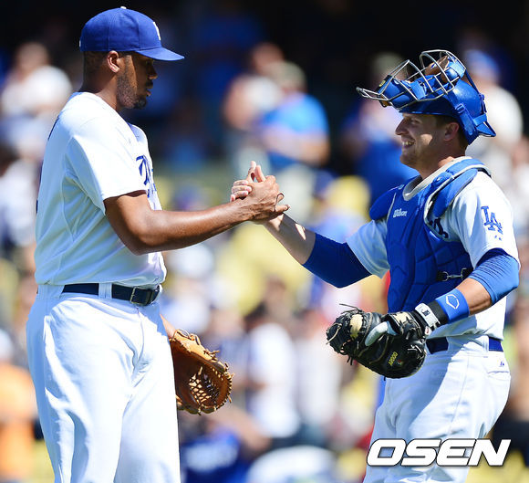 경기를 마치고 다저스 마무리 켄리 잰슨과 팀 페더로위츠가 하이파이브를 하고 있다. / rumi@osen.co.kr