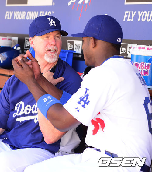 5회초에 교체된 다저스 야시엘 푸이그가 마크 맥과이어 타격 코치와 얘기를 나누고 있다. / rumi@osen.co.kr