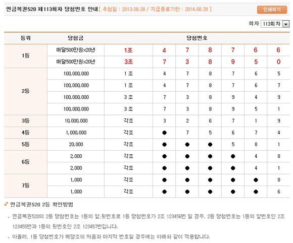 [OSEN=이슈팀] 매월 500만원씩 20년간 받게 되는 연금복권520 113회 당첨번호가 발표됐다.
