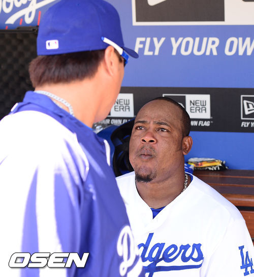 덕아웃에서 류현진이 유리베와 서로 바라보며 장난을 치고 있다. / rumi@osen.co.kr