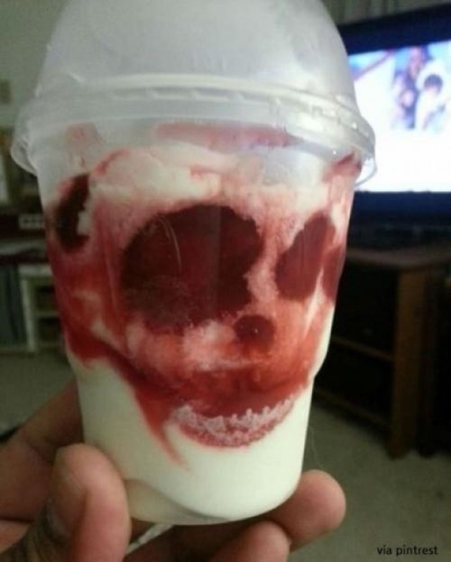 사진을 보면 일반 컵 아이스크림에 붉은색 시럽이 녹아들면서 절묘하게 해골 모양을 만들어 냈다. 뻥뚫린 눈 부위에 빨간색 시럽이 차면서 오싹한 모습을 보여 ‘먹기 무서운 아이스크림’이라는 별명이 붙었다.