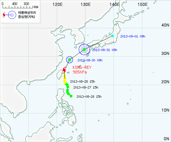 한편 지난 26일 오후 3시경 필리핀 동남동쪽 460㎞ 인근 해상에서 발생한 콩레이는 중심기압 985hPa, 중심부근 최대풍속 27km의 소형태풍이다.