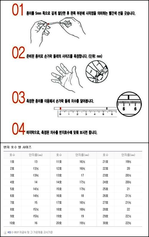 직접 매장에 들러서 끼워보고 사는 경우에는 반지 호수를 몰라도 되지만,온라인상에서 제품을 구매하는 경우 자신의 반지 호수를 정확히 알고 구매할수 있는 정보이다.