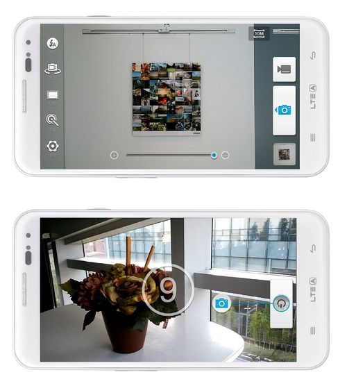 촬영 버튼을 드래그해 간편하게 타이머 기능을 작동시킬 수 있으며 카메라 버튼과 동영상 버튼을 동시에 보여줘 빠른 모드전환 및 촬영이 가능하다. 또한 플래시, 전/후면 카메라 전환, 설정 등 사용자들이 빈번하게 이용하는 기능들을 고정 배치시켜 사용편의성을 높였다.