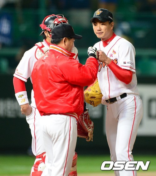 이만수 SK 와이번스 감독이 29일 문학 삼성전 선발 투수 김광현(SK)에게 조언을 건넸다. 김광현은 21일 대구 삼성전서 4⅔이닝 9피안타(2피홈런) 1사구 4탈삼진 8실점으로 무너진 바 있다.