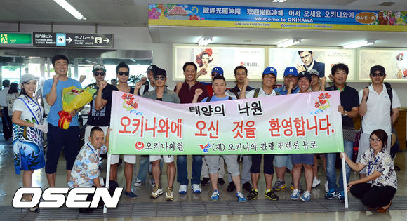 오키나와 관관청 직원들이 29일 나하 공항에 나와 ‘태양의 낙원 오키나와에 온 것을 환영한다’는 플래카드를 들고 ‘니베아 맨 올스타’ 팀을 환영하고 있다. /오키나와(일본)=정송이 기자 ouxou@osen.co.kr