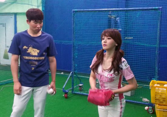 에이스 이재학의 시구 지도를 받고 29일 마산 NC-두산전 경기 개시 직전 마운드에 오른 서유리씨. 대체로 시구자들이 마운드보다 앞에 서서 공을 던지는 경우가 대부분이지만 서유리씨는 현역 투수들처럼 마운드에 오르는 패기를 보여줬다. 그러나 정작 공은 자신이 선 곳에서 얼마 떨어지지 않은 곳에 바운드되고 말았다.