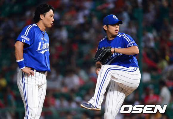 29일 오후 인천 문학구장에서 열린 '2013 한국야쿠르트 세븐 프로야구' SK 와이번스와 삼성 라이온즈의 경기, 3회초 이닝종료 후 삼성 이승엽과 윤성환 선발투수가 이야기를 나누고 있다