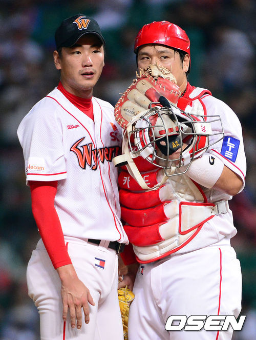 29일 오후 인천 문학구장에서 열린 '2013 한국야쿠르트 세븐 프로야구' SK 와이번스와 삼성 라이온즈의 경기, 3회초 1사 만루 SK 김광현 선발투수가 정상호 포수와 이야기를 나누고 있다