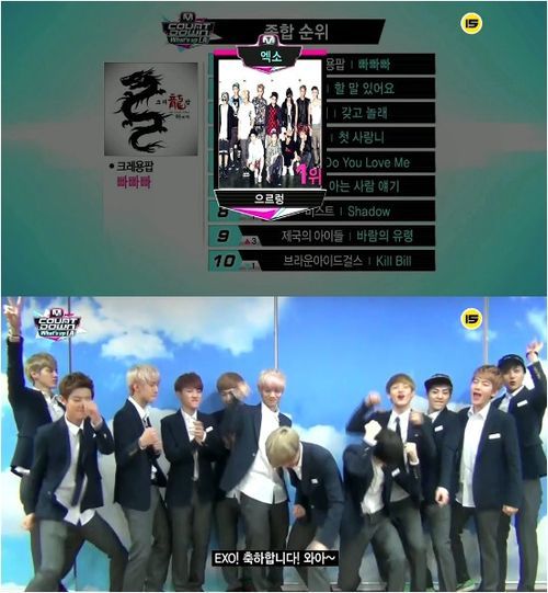엑소는 “지금까지처럼 열심히 하는 엑소가 되겠다”고 수상 소감을 밝혔다. 앞서 엑소는 지난 22일에도 ‘엠카운트다운’ 1위를 한 바 있다. 이로써 엑소는 2주 연속 강력한 경쟁자인 크레용팝의 ‘빠빠빠’를 제치고 2주 연속 1위를 했다.