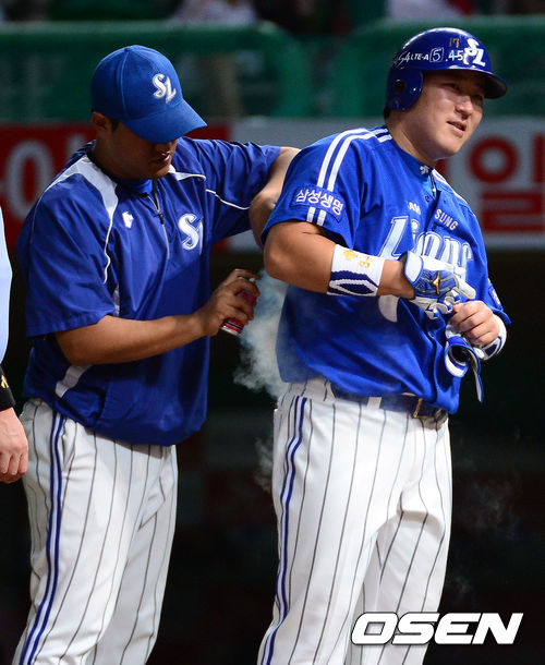 29일 오후 인천 문학구장에서 열린 '2013 한국야쿠르트 세븐 프로야구' SK 와이번스와 삼성 라이온즈의 경기, 5회초 1사 삼성 최형우가 SK 선발투수 김광현의 투구에 맞은뒤 치료를 받고 있다
