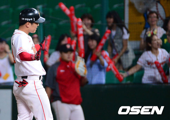 29일 오후 인천 문학구장에서 열린 '2013 한국야쿠르트 세븐 프로야구' SK 와이번스와 삼성 라이온즈의 경기, 7회말 1사 만루 SK 정근우가 역전 1타점 적시타를 날린후 박수를 치며 기뻐하고 있다