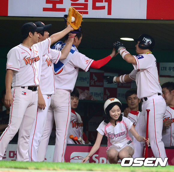 29일 오후 인천 문학구장에서 열린 '2013 한국야쿠르트 세븐 프로야구' SK 와이번스와 삼성 라이온즈의 경기, 7회말 1사 만루 SK 한동민의 밀어내기 볼넷때 3루 주자 김강민이 홈을 밟은 후 동료들의 축하를 받고 있다