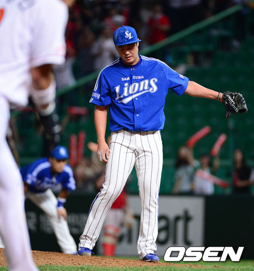 29일 오후 인천 문학구장에서 열린 '2013 한국야쿠르트 세븐 프로야구' SK 와이번스와 삼성 라이온즈의 경기, 7회말 1사 만루 SK 한동민에게 밀어내기 볼넷을 허용한 삼성 안지만 투수가 아쉬워하고 있다