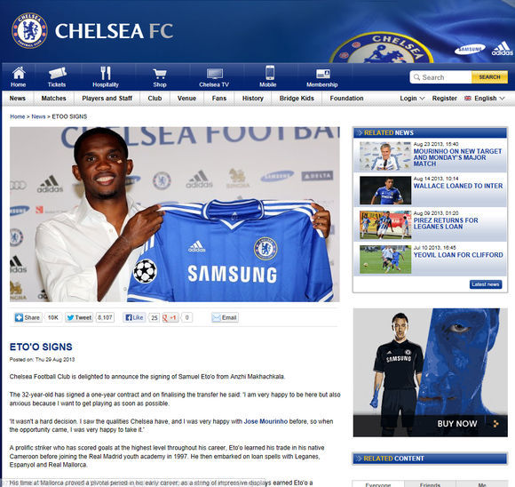 첼시가 부족한 전방 공격진을 보강했다. 첼시는 지난 29일(이하 한국시간) 공식 홈페이지를 통해 "에투와 계약을 맺었다"고 발표하며, "에투와 계약을 맺게 됐다는 사실을 발표하게 돼 기쁘다"고 덧붙였다.
