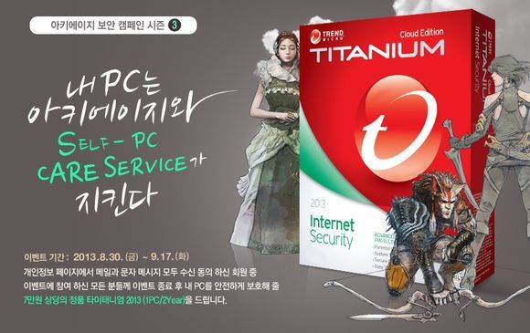이번 '아키에이지 보안 캠페인 시즌3' 이벤트는 아키에이지 홈페이지의 개인정보 수정 페이지에서 메일과 문자를 수신 동의한 회원 중 이벤트에 참여한 모든 회원에게 '정품 타이태니엄 2013' 백신 2년 이용권을 무료로 지급하는 행사다.