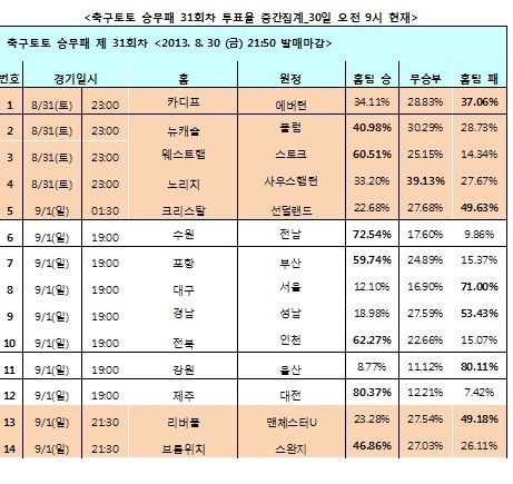 축구토토 승무패 31회차 투표율 중간집계 결과