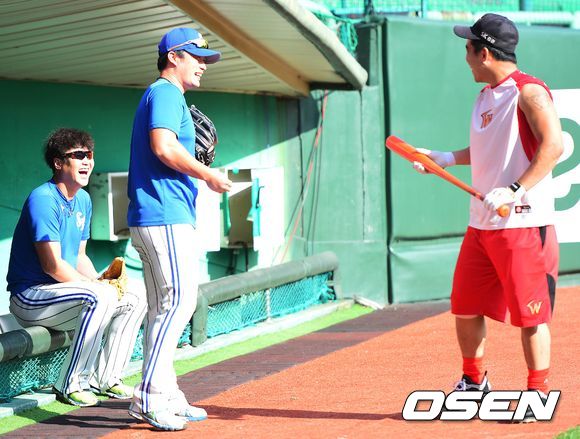 30일 오후 인천 문학구장에서 열리는 '2013 한국야쿠르트 세븐 프로야구' SK 와이번스 대 삼성 라이온즈의 경기를 앞두고 SK 정근우와 삼성 안지만, 오승환이 대화를 나누고 있다.