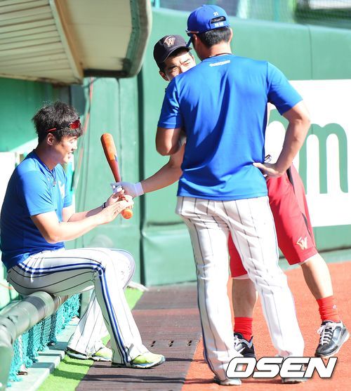 30일 오후 인천 문학구장에서 열리는 '2013 한국야쿠르트 세븐 프로야구' SK 와이번스 대 삼성 라이온즈의 경기를 앞두고, SK 정근우와 삼성 안지만, 오승환이 대화를 나누고 있다.