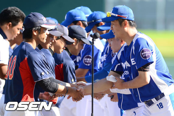 30일 오후 일본 오키나와 나하시 셀룰러 스타디움에서 열린 '제4회 니베아 맨 컵 전국생활체육야구대회 스페셜 이벤트 한-일 사회인야구 드림리그' 경기에 앞서 양팀 선수들이 인사를 나누고 있다.